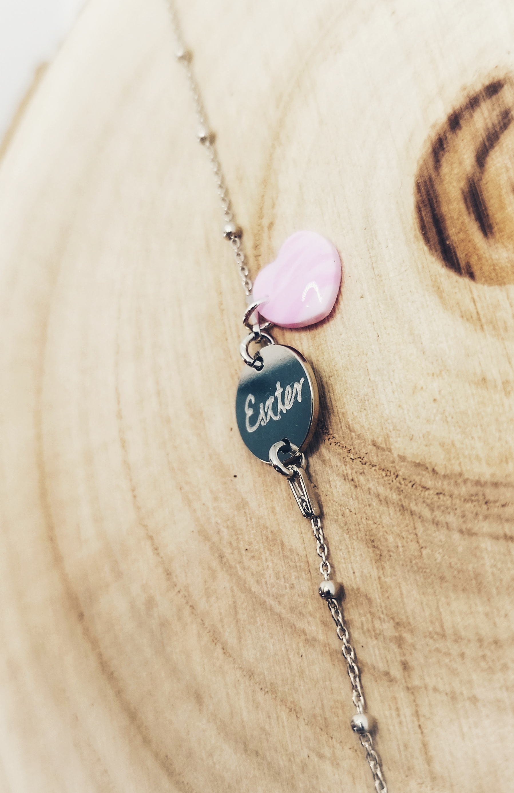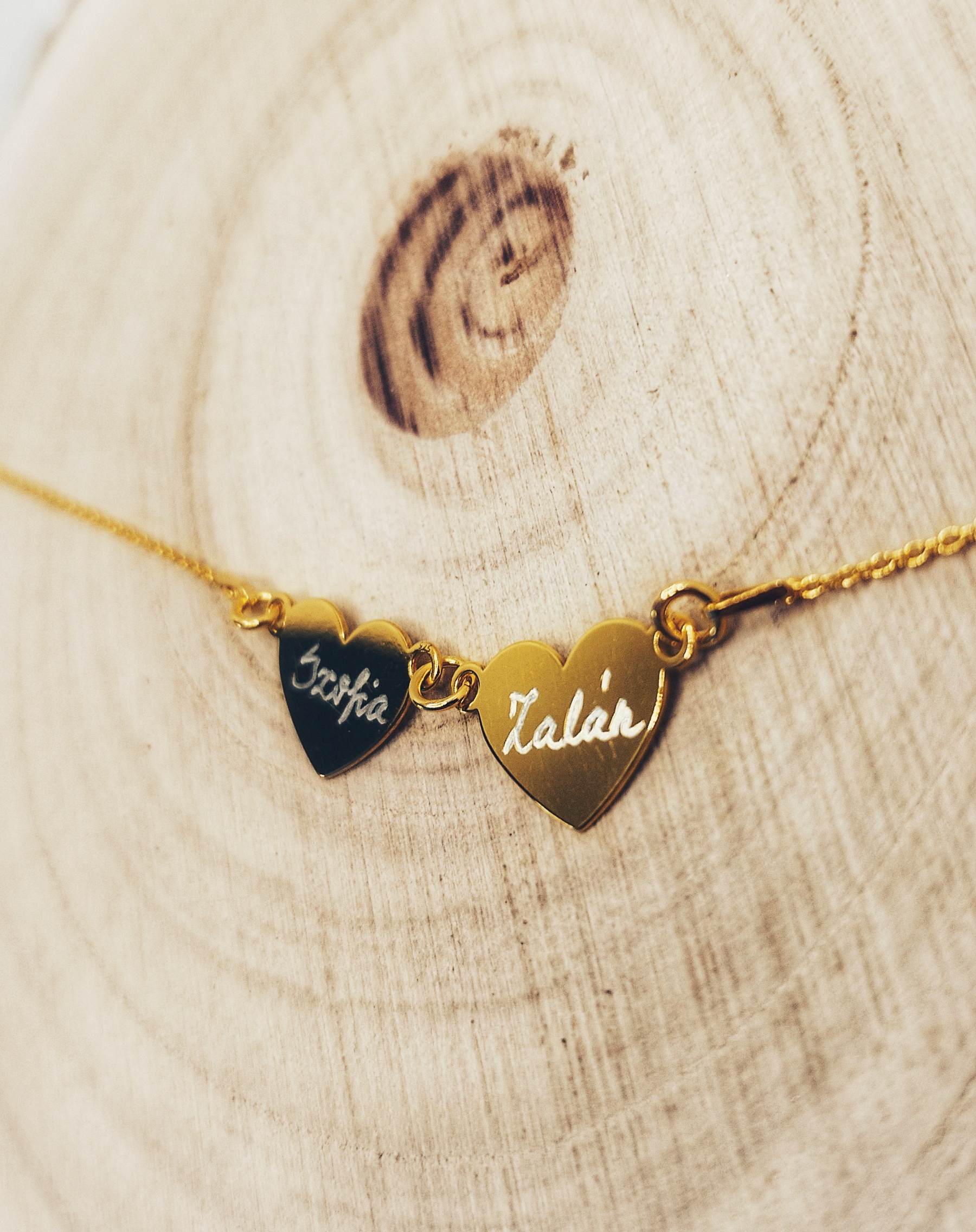 Egy gravírozott nyakláncon vagy karkötőn lehet:
